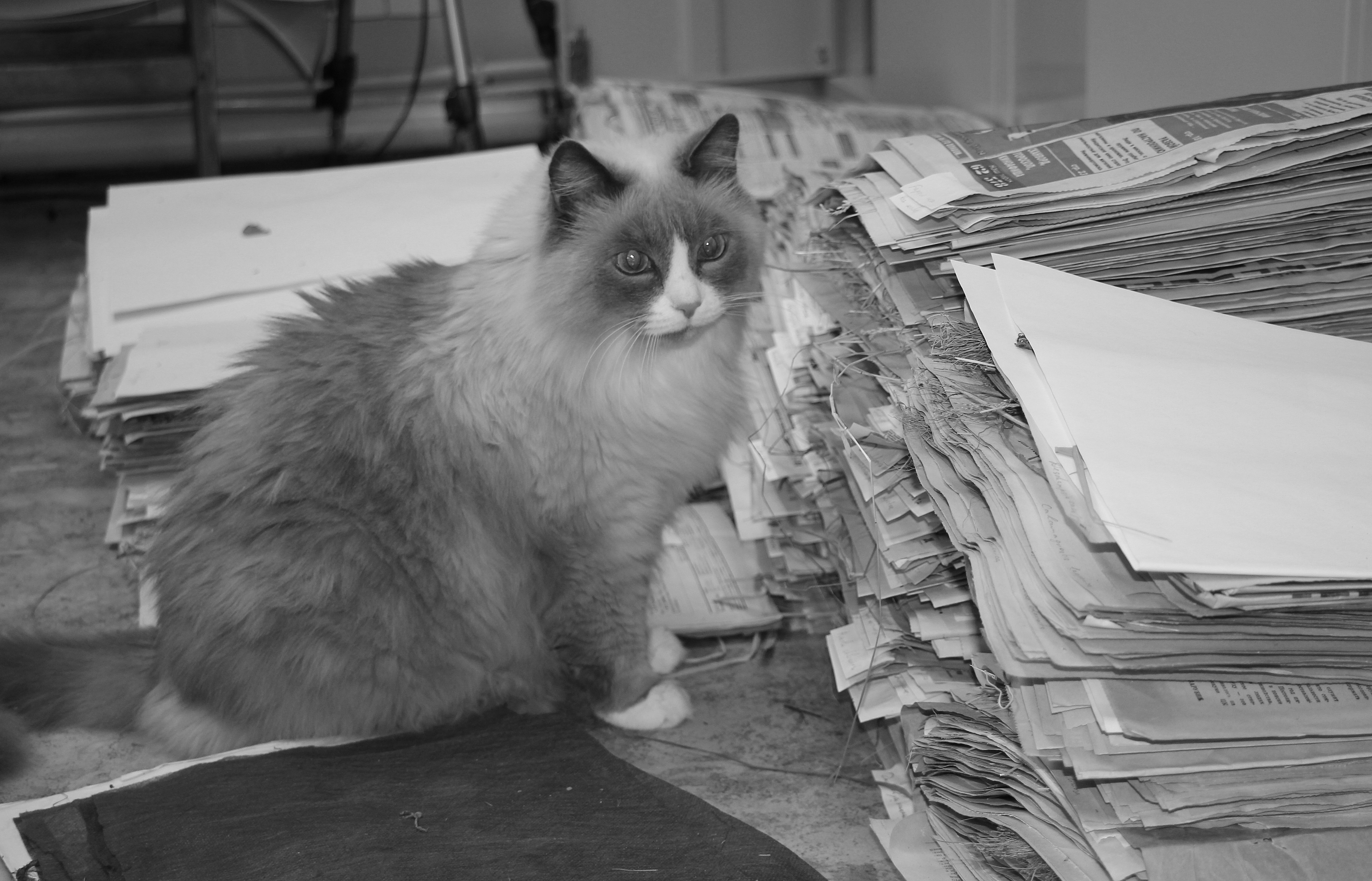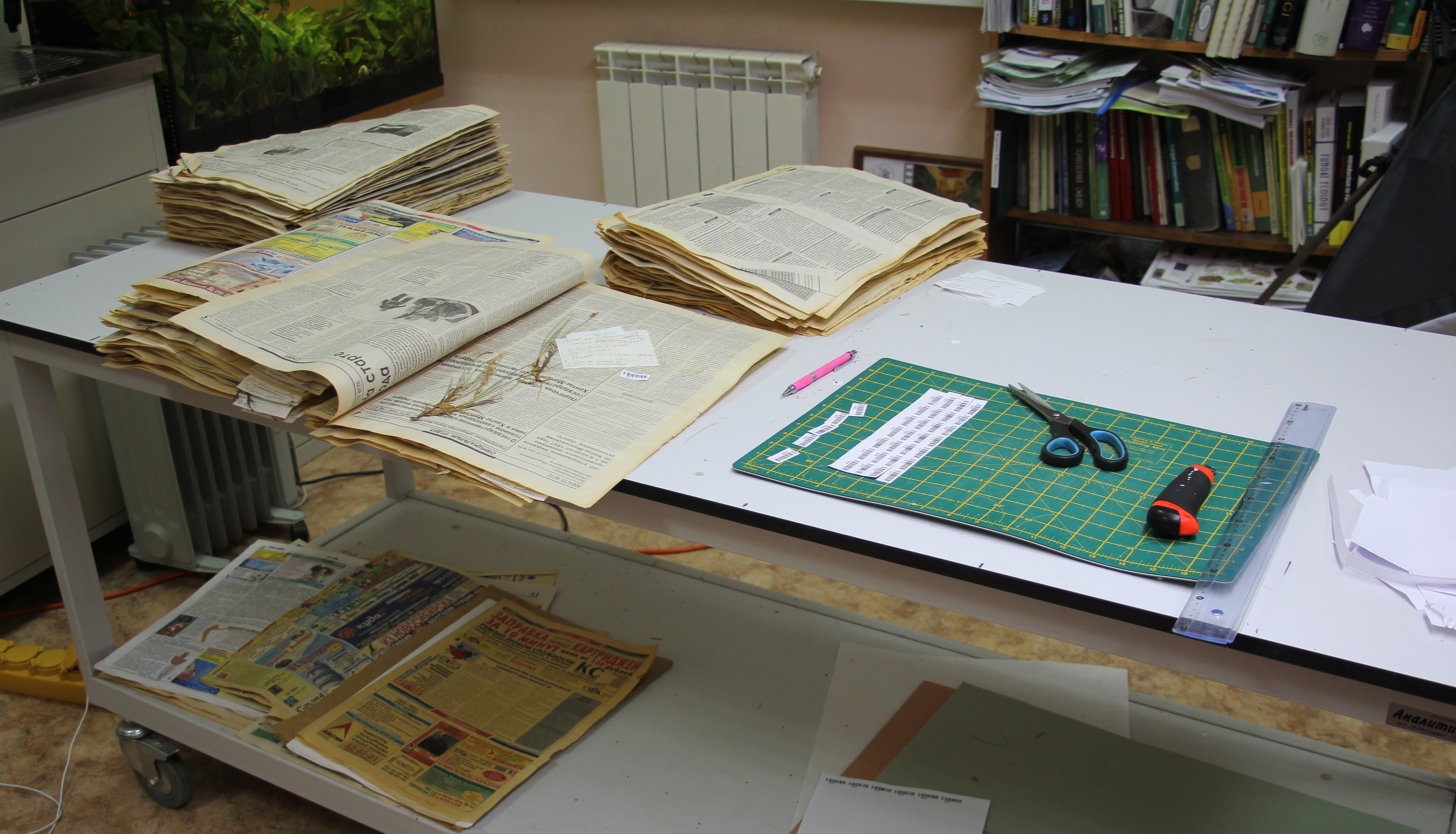 На фотографиях: 1 — кот в гербарии ЮГУ приступает оцифровке, гербарий рассортирован по годам (до этого лежал как попало в разных углах), подготовлен к монтажу; 2 — здесь мы вкладываем штрихкоды в не смонтированные образцы, чтобы оценить предварительно общее количество их для последующих работ, они буду приклеиваться после монтажа; 3 — общий вид стола во время подготовки гербария к монтажу.
