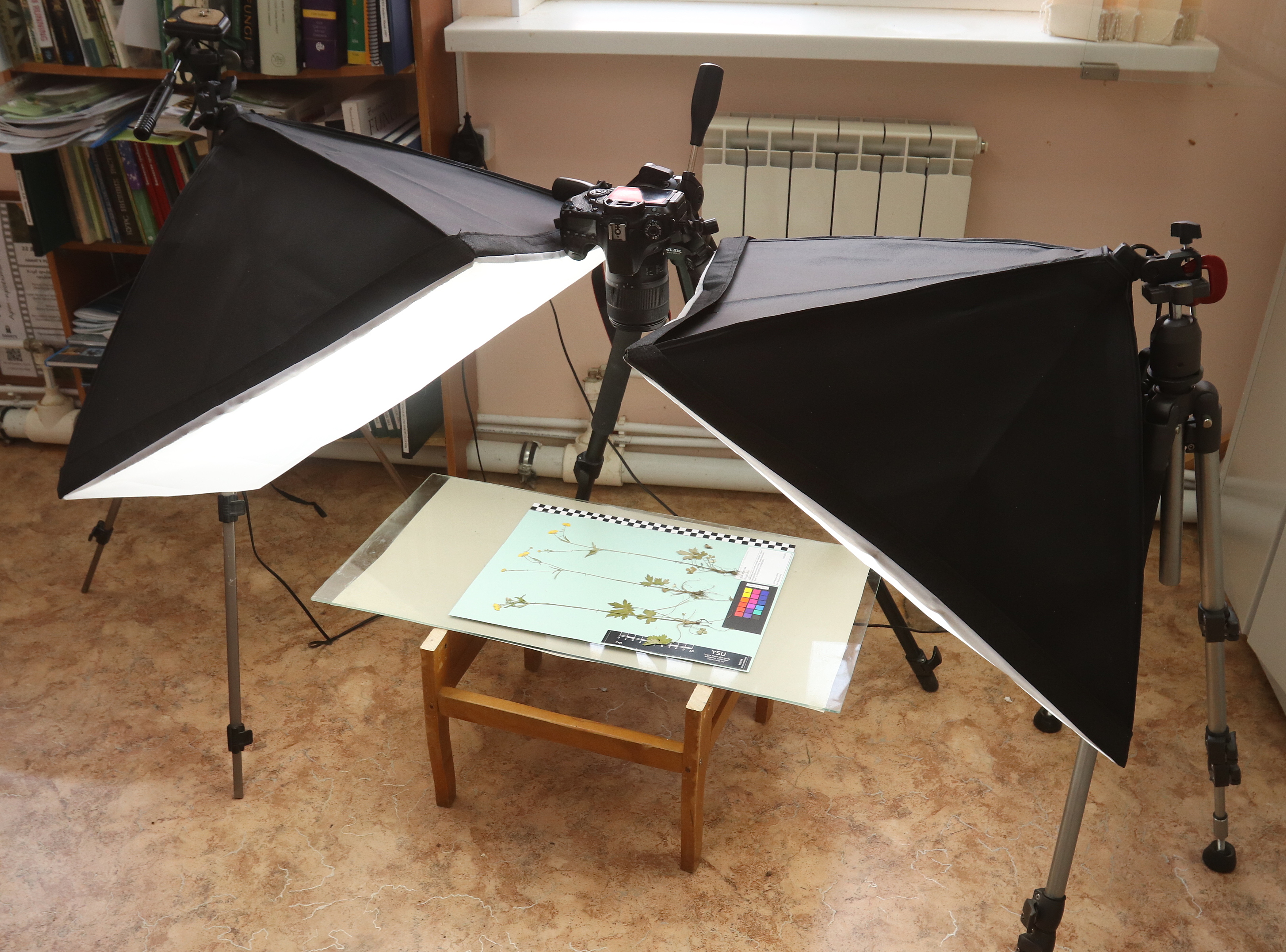 - Освещение на столике очень важно. Оно должно быть нейтральным (дневной свет), мягким (можно использовать софтбокс или светорассеивающую ткань), достаточно интенсивным. Например, в нашем гербарии используется две светодиодные лампы по 30 Вт (с двух сторон от столика), покрытые софтбоксами